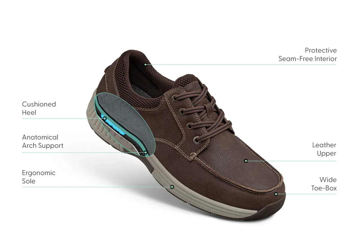 With knockabout good looks and a durable, flexible leather upper, Leo defends your walking comfort everywhere you go. A roomy, padded interior with adjustable depth and anatomical arch support provides customizable, irritation-free support. The cushioned Ortho-Cushion™ System insole, mild rocker design, and high-traction outsole take pressure off pain points and stabilize every step.